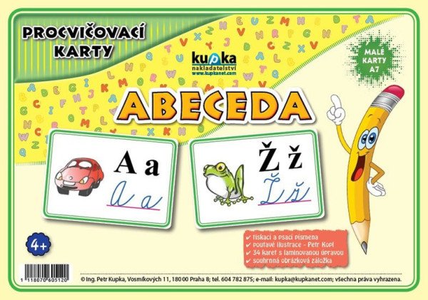 Sada karet určená pro začínající školáky k procvičování abecedy. Sada obsahuje 34 karet s laminovanou úpravou velikosti 10 x 7 cm (4 obrázky na kartě formátu A5 určené k rozstříhání). Každá karta obsahuje tiskací a psací písmeno a veselý obrázek.
