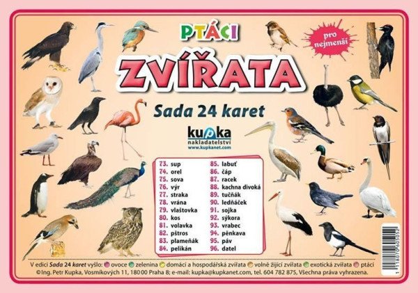 Univerzální sada fotografií pomůže předškolákům a malým školákům poznat svět zvířat. Sada obsahuje 24 karet velikosti 10 x 7 cm (4 obrázky na kartě formátu A5 určené k rozstříhání). Tuto praktickou učební pomůcku využijí jak učitelé MŠ a 1. stupně ZŠ při samostatné práci ve skupinkách, tak rodiče se svými dětmi při hravém učení. Titul obsahuje 24 fotografií nejznámějších ptáků (zvláště druhy, které lze spatřit u nás v přírodě).