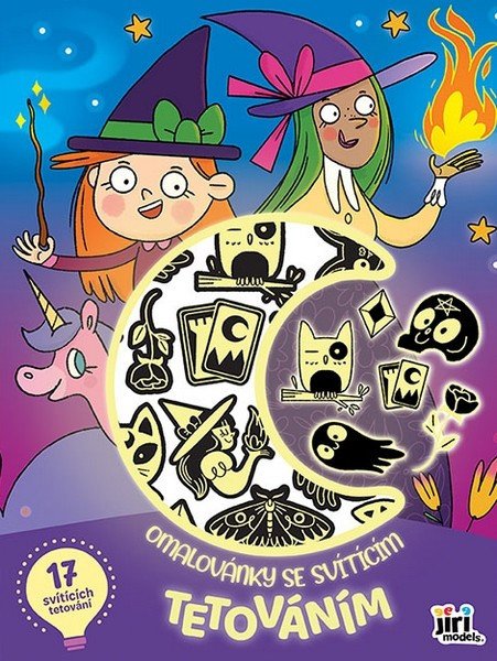 Omalovánky obsahují 16 barevných stran s obrázky k vybarvení a list originálních tetovaček, které ve tmě svítí.